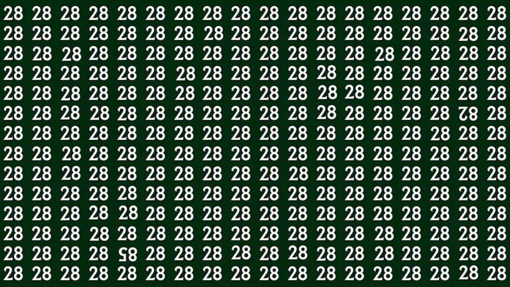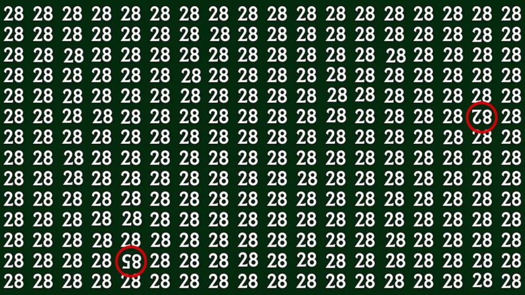 This optical illusion is a clever test of visual perception, pattern recognition, and reaction under time pressure. By embedding inverted “82” and “85” among identical “28”s, the puzzle challenges your mind to overcome its own assumptions about uniformity.
